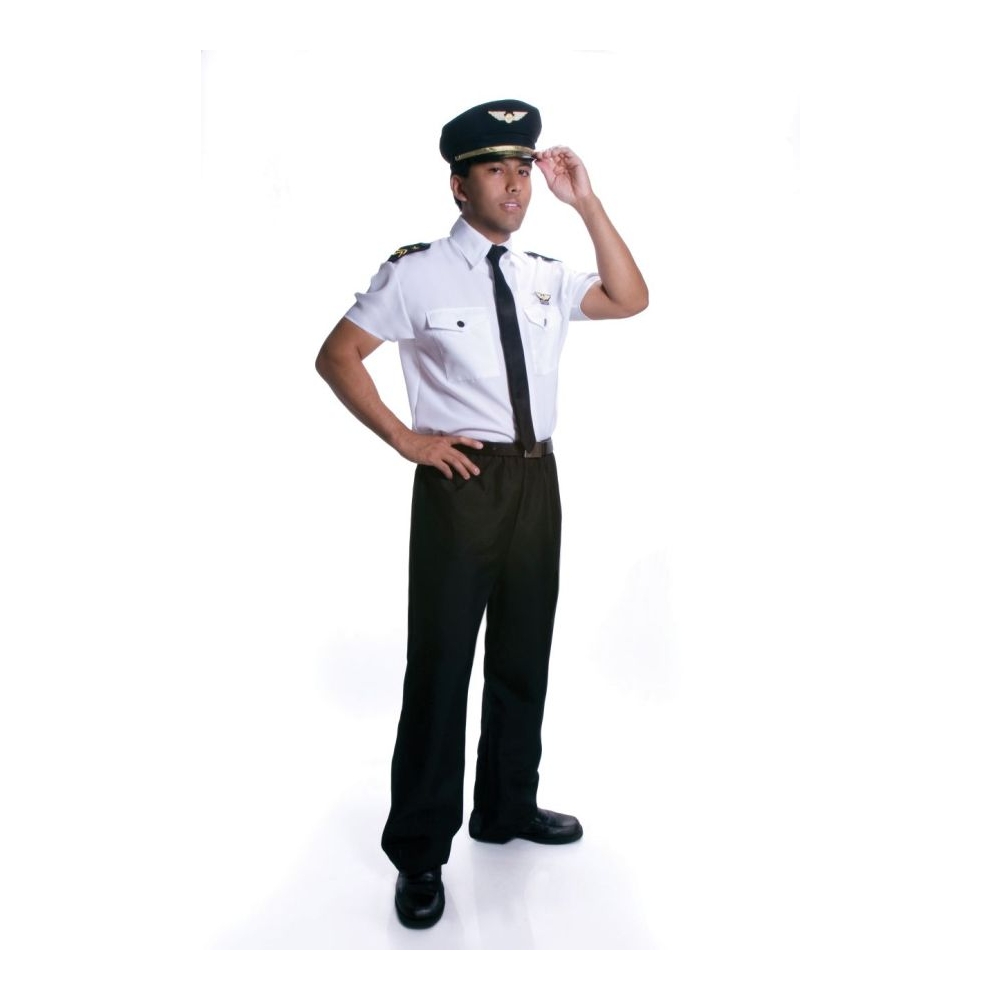 Adult Pilot Comes Complete With Shirt With Attached Tie, Pants, And Pilot Hat. Even Has Real Buttons, Pleated Button Shirt Pockets, And Embroidered Patches. Machine Washable Polyester. Adult Medium 38-40.