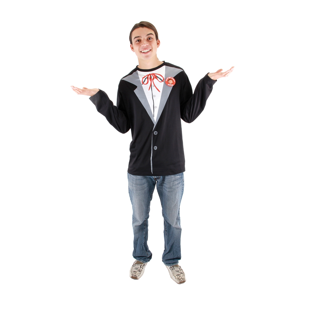 Easy Long Sleeved T-Shirt Makes You Look Like Your Favorite Mad Magazine Character, Alfred E. Newman. Adult Med-Small Fits Sizes 44-48. Comes With A Button.