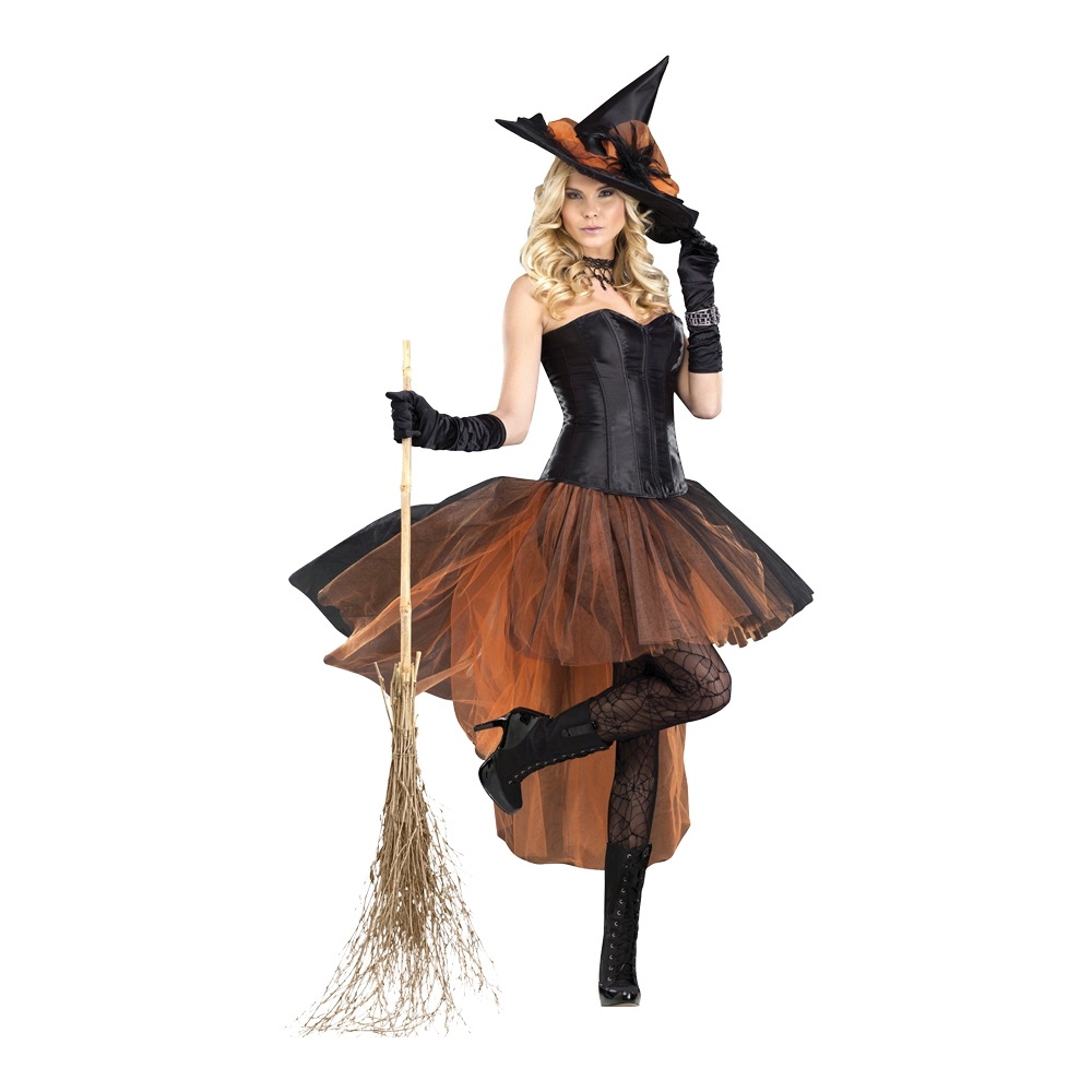 A Sexy Take On The Classic Witch Costume. Satin, Boned Corset With Sexy Lace-Up Back, Pumpkin Orange And Midnight Black Layered Tulle Skirt With Layered Tulle Train, And Satin Witch Hat With Orange And Black Tulle Hatband And Rosette. Large Adult Size Fits Sizes 12-14. Jewelry, Boots, Stockings, Gloves, And Broom Are Not Included.