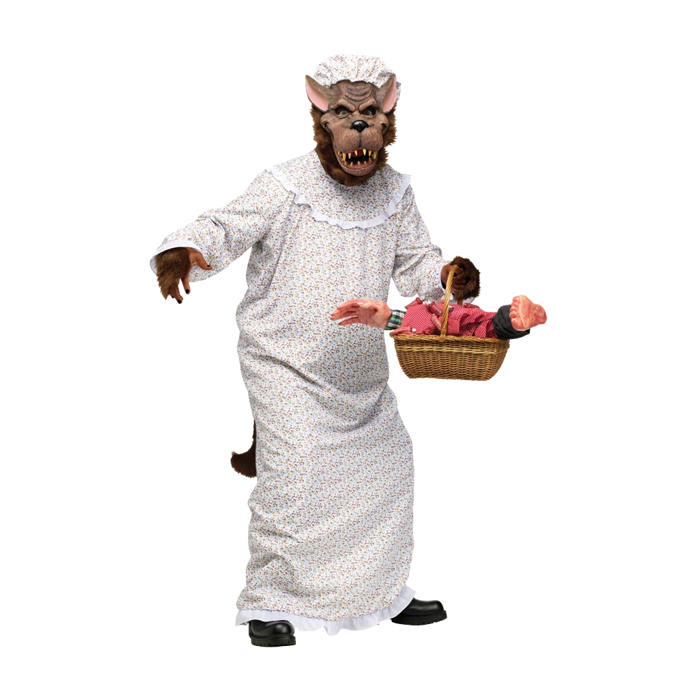 Includes Granny Nightgown With Plush Sleeve Cuffs And Attached Wolf Tail, Mask With Attached Matching Mop Cap. Basket With Body Parts Not Included. Fits Most Adults Up To 6' 200 Lbs.