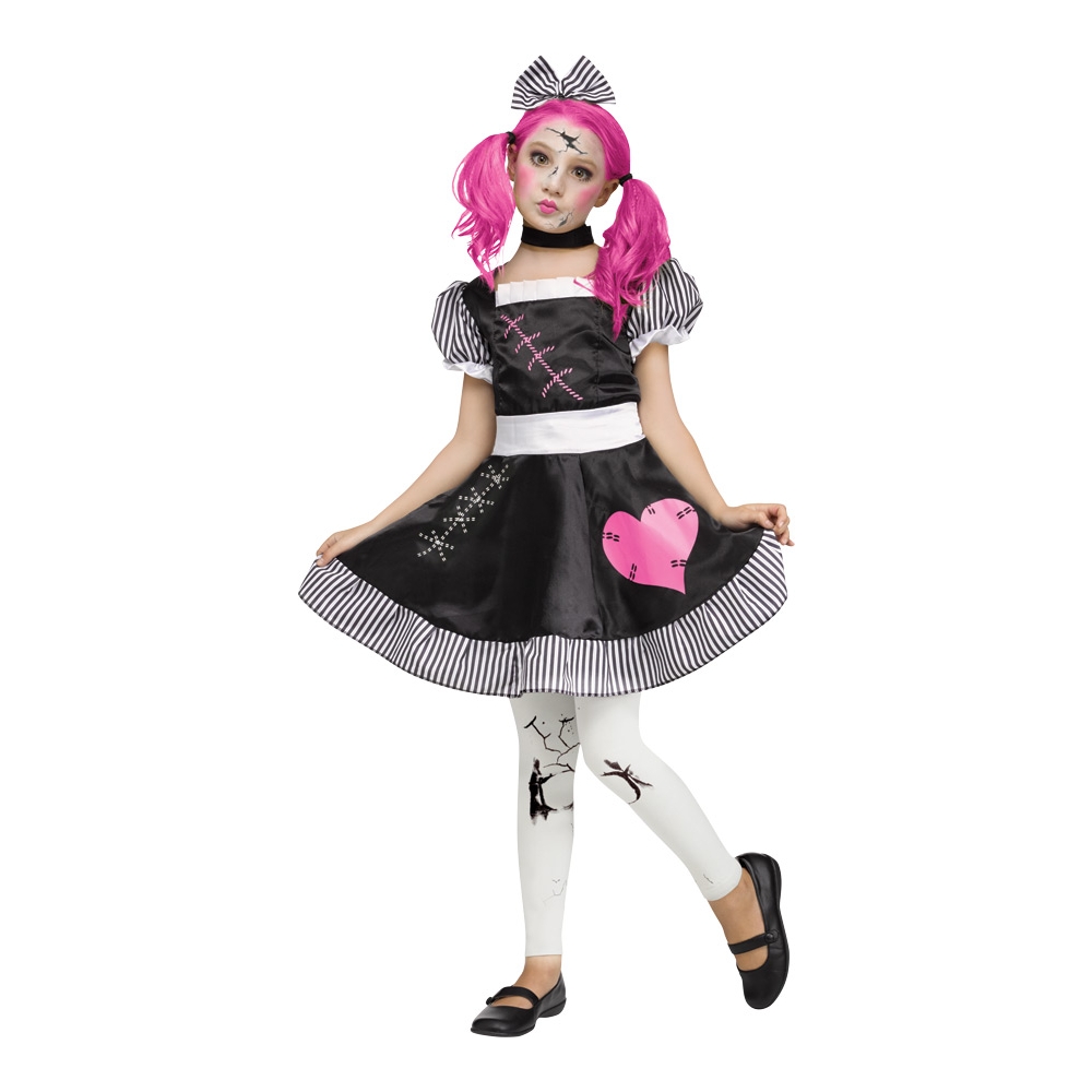 A Broken Doll Can Be Eerily Sad And Creepy, A Perfect Scary Costume For Your Next Halloween Party! Black Dress With Striped Trim And Printed Stitching With A Pink Heart Comes With A Black Choker, Striped Hair Bow, And Printed Footless Tights. Dress 100% Polyester Exclusive Of Decoration. Tights: 92% Nylon, 8% Spandex. Fits Child Size 4-6.