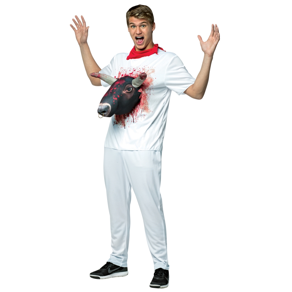Heads Will Turn When You Wear This To Your Next Halloween Party! White T-Shirt With Red Neck Kerchief Has A 3-D Bull Protruding From The Chest! Blood Accents Cover The Shirt And The Stuffed Bull Head And Horns. Add Your Own Pants! 100% Polyester. Spot Clean, Hang Dry. Fits Adult Sizes Large/Ex Large, Chest Sizes 36-42.