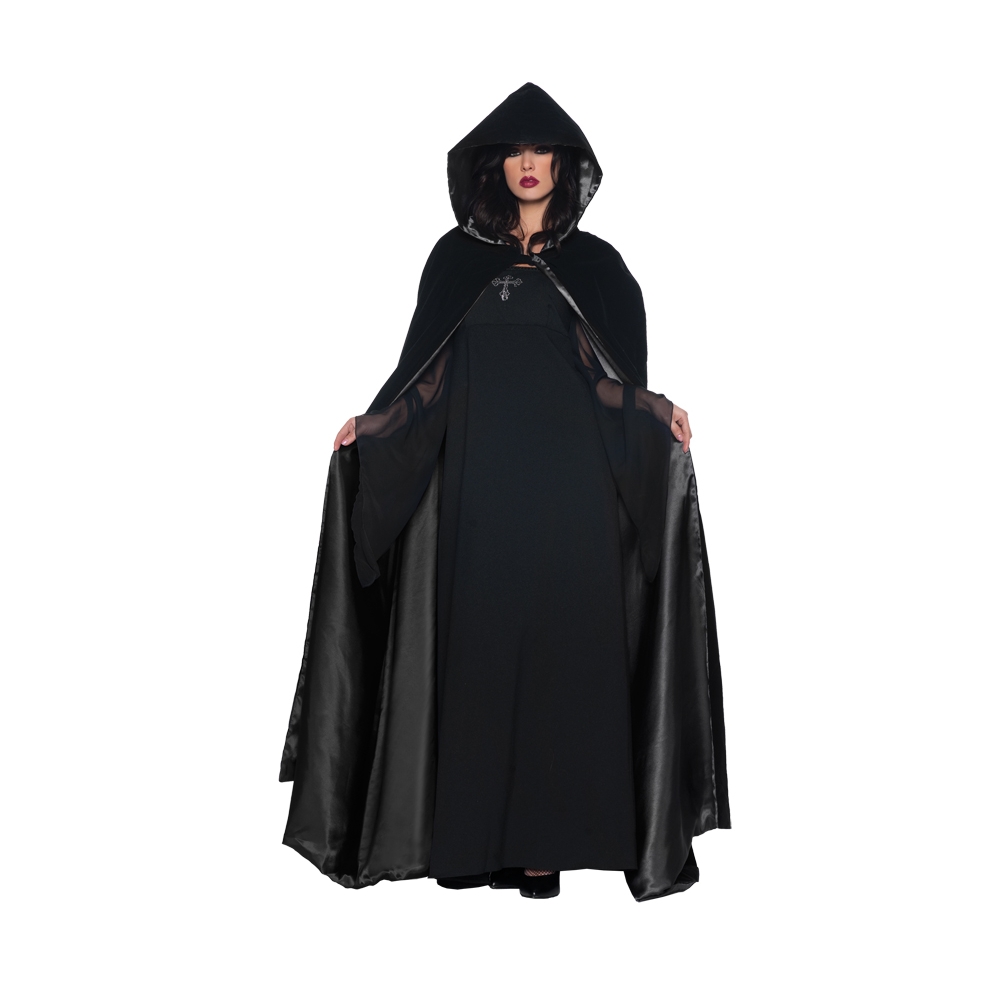 Black Velvet Cape With Hood And Black Satin Lining. One Size Fits Most. Hood Is Roughly Ten Inches Deep.
