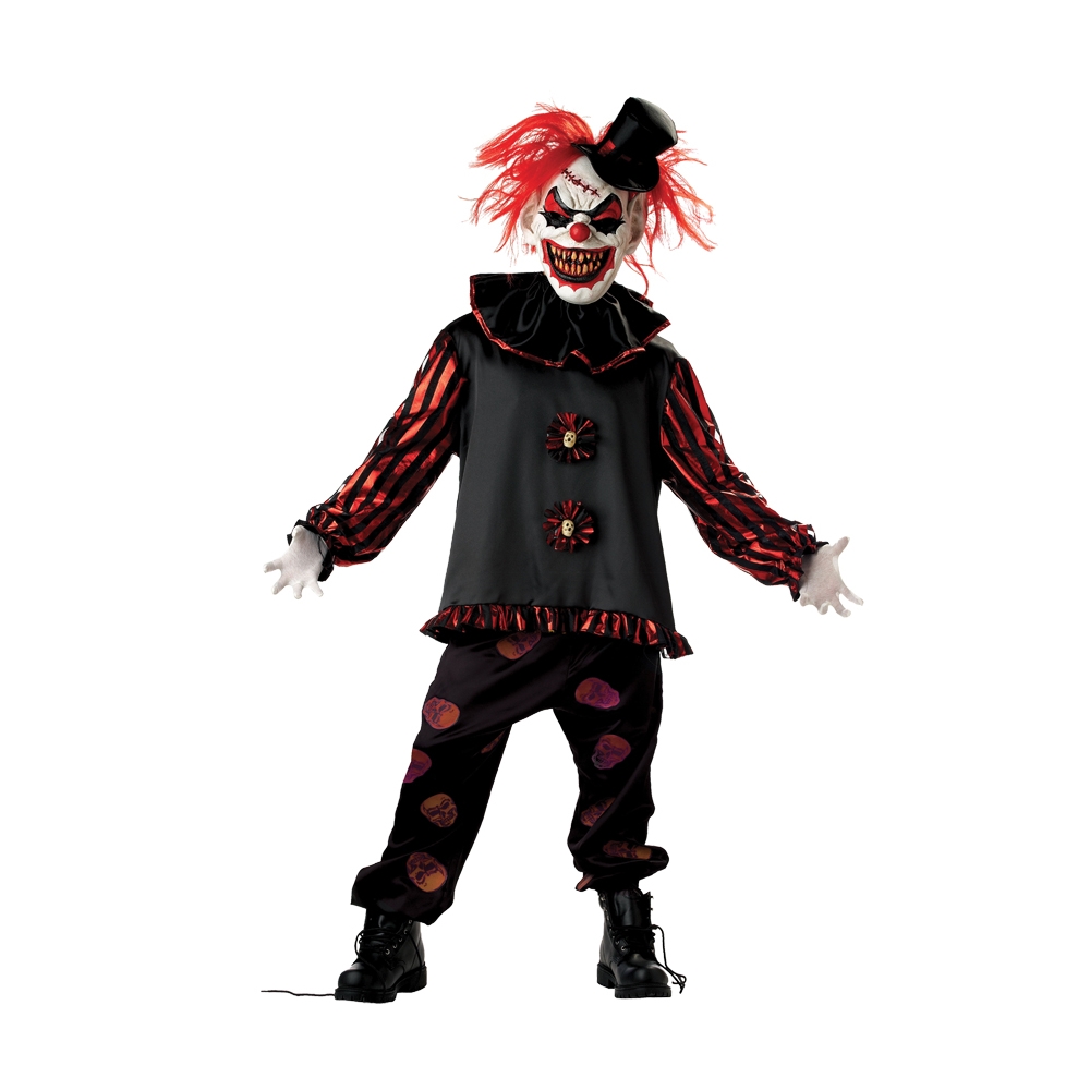 Scared Of Clowns? You Will Be! Demented, Grinning Evil Clown Costume Includes Long Sleeve Shirt, Screen Printed Skull Pants, Mask With Hair, Hat, And Neck Ruffle. White Gloves (Ba01) Sold Separately. Child 12-14.