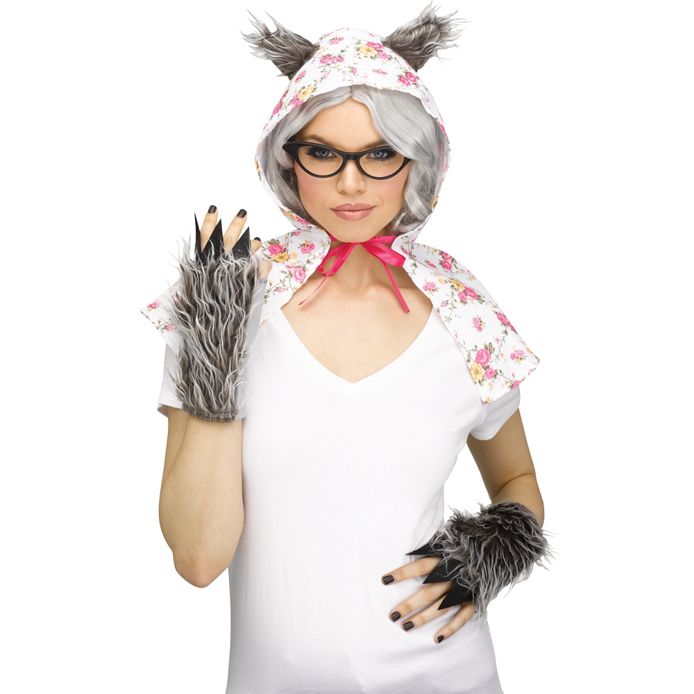 Become one of your favorite villainous storybook characters. This granny wolf kit is a quick and easy way to dress up. Grab a friend to go as Red Riding Hood. The Enchanted Woods Granny Wolf Instant Kit features a floral print hooded capelet with attached grey plush ears, plush hand mitts and glasses. One size fits most adults. Wig and shirt not included.