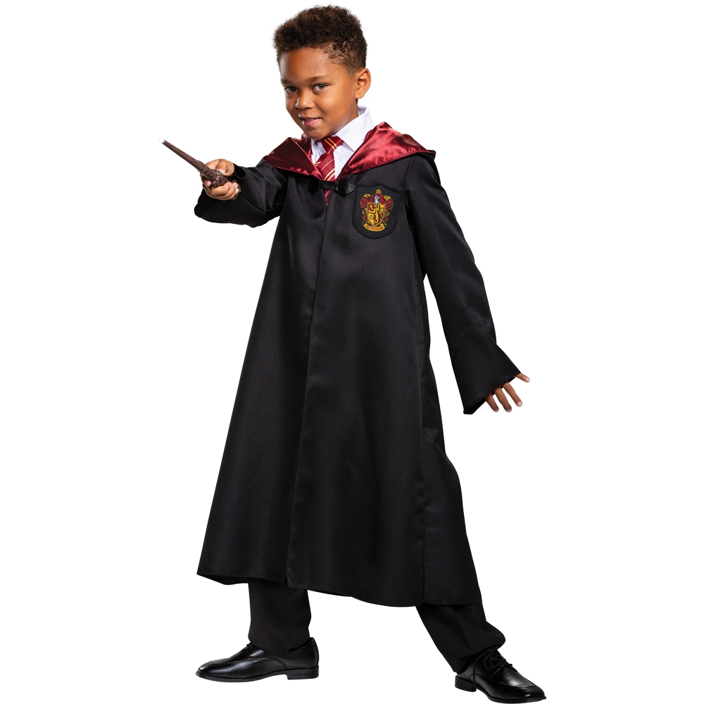 Become a brave, daring and couragous student of Hogwartís Gryffindor House. Show your love of the wizarding world when stepping out in this Childís Classic Gryffindor Student Robe. Grab your magic wand and let the fun begin! Swish your black robe and make a dramatic entrance this Halloween. The Harry Potter Childís Classic Gryffindor Robe features a black robe with Gryffindor crest and red satin lined hood. Pants, white shirt, tie, wand and shoes not included.