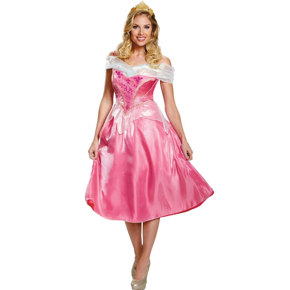 Make your magical fairytale dreams come true and live happily ever after with this stunning Sleeping Beauty Costume. Inspired from the Disney movie, Sleeping Beauty, this beautiful Womenís Aurora Dress will transform you into your favorite Disney Princess. The Disney Sleeping Beauty Aurora Deluxe Adult Costume features a pink dress with white off-the-shoulder sheer sleeves, gold trim on bodice and sheer overlay on skirt. Also comes with gold crown headband to complete this Disney Princess look. Shoes not included.