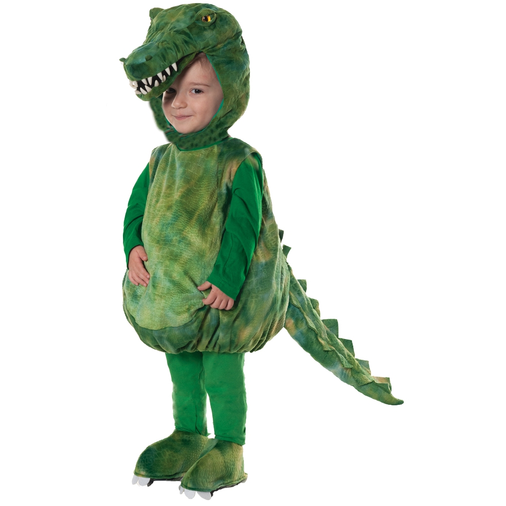 Now your little one can transform into their favorite reptile this Halloween. Donít worry, this cuddly swamp gator wonít bite! The Alligator toddler costume includes a sleeveless green plush body with an attached spiked tail, hood and shoe covers. The stuffed headpiece features an alligator with yellow eyes and pointy teeth. Hood fastens around the chin. Long sleeve green shirt and pants not included.