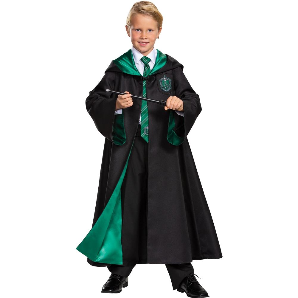 Swish your black robe and make a dramatic entrance this Halloween dressed in this Prestige Harry Potter Slytherin Robe. Grab your wand and let the magic begin when you wander the halls of Hogwarts School of Witchcraft and Wizardy. Represent your Hogwarts House and carry on Salazar Slytherinís legacy dressed in this high quality Harry Potter Slytherin The Harry Potter Childís Prestige Slytherin Robe features a black robe with Slytherin crest and green satin lined hood, sleeves and lapels. Pants, white shirt, tie, wand and shoes not included.