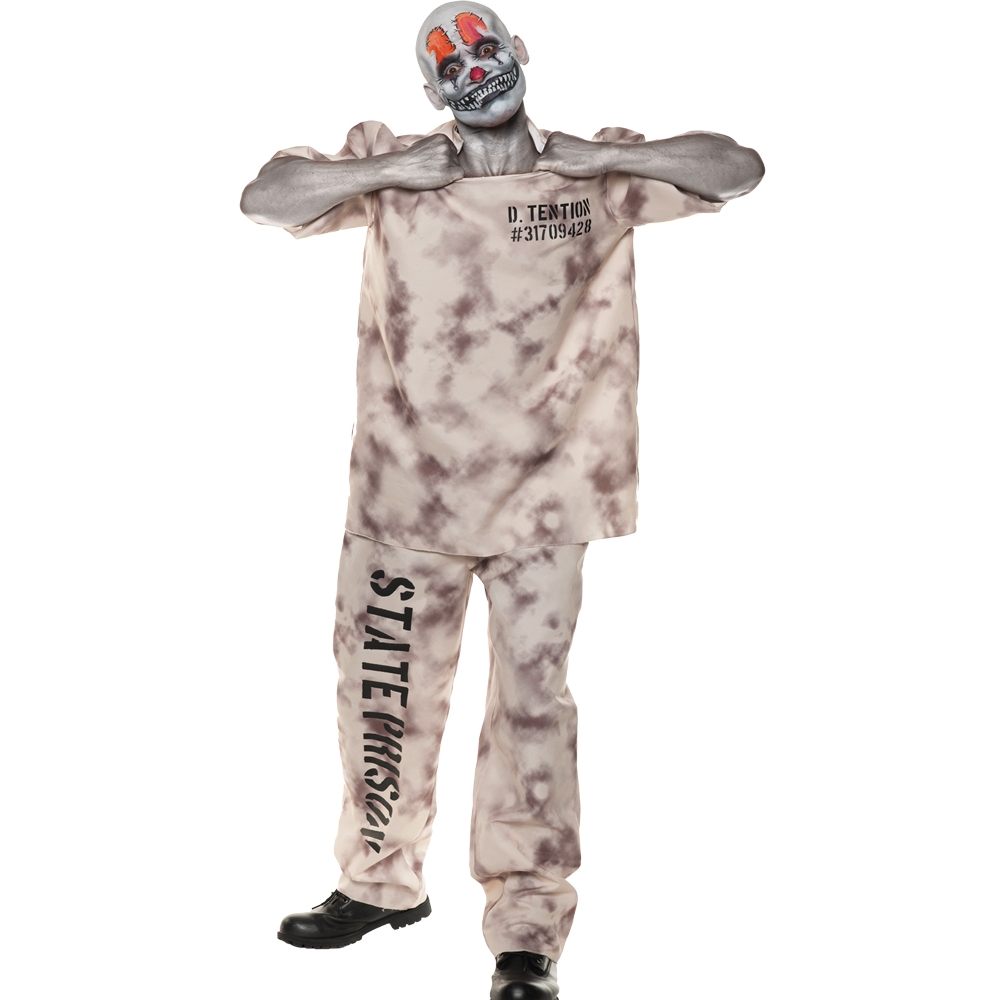 This prisoner outfit will make everyone wonder what crimes you committed. Steal the spotlight this Halloween dressed as this insane and deranged criminal. The Adult Menís D. Tention Costume features a light beige shirt and matching pants with greyish-brown spotting throughout the outfit. The shirt has screen print ìD. Tentionî on chest and ìSTATE PRISONî going down one leg of the pants. Clown makeup and shoes not included.