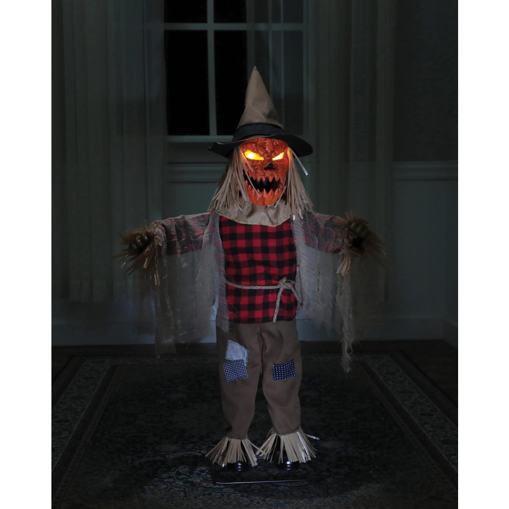 Make way for a very special Scarecrow with a message for you! This 36-inch Twitching Scarecrow Animated Prop will add a menacing air of mystery to your haunted scene! His Arms Wave back and forth, his Head with Yellow Light-up Eyes Turns, and his Orange Pumpkin Face with a Jagged Mouth Moves while he Speaks 5 different eerie Phrases: