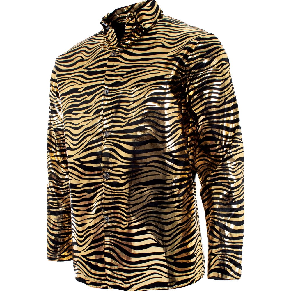 Show off your wild side in this funky shirt. Become the king of the jungle when you step out in this shiny gold and black sleeve shirt. This Adult Gold Tiger Shirt features shiny gold and black tiger print shirt with collar.