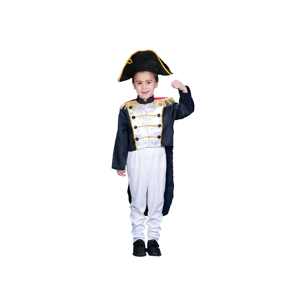 Double Breasted Tailcoat With Attached Gold-Fringed Red Epaulettes And White Elastic-Waist Pants Comes With Black Hat With Gold Trim. Flame Resistant Polyester. Gentle Machine Washable. Child Size Medium 8-10.
