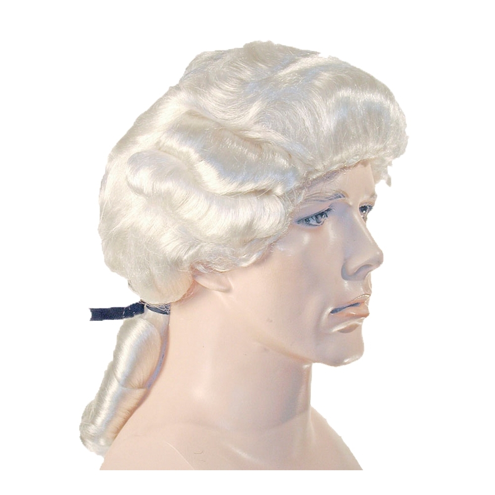 Deluxe Colonial Man Has Two Curls On Each Side With A Wavy Crown And Ponytail With Banana Curls Tied With A Black Bow. Made In A Very Fine White Fiber. Snow White.