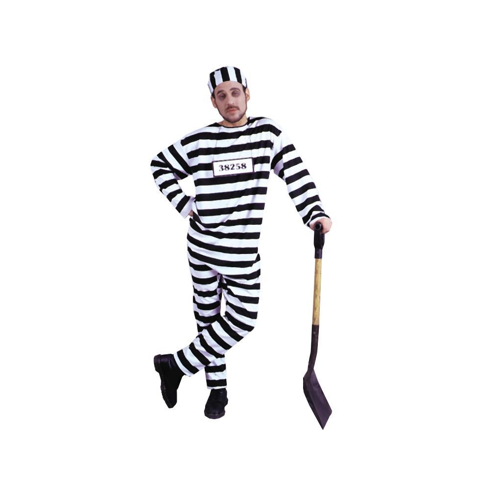 Convict Costume Is Black And White Striped Polyester. It Includes A Long Sleeve Shirt With Number Patch, Elastic Waist Pants, And A Matching Striped Hat. Plus Size Fits Most Men Up To 6'3", Under 300 Lbs. Waist Size Is 42 To 46 Inches. Chest Size Is 48 To 50". Handcuffs Not Included.