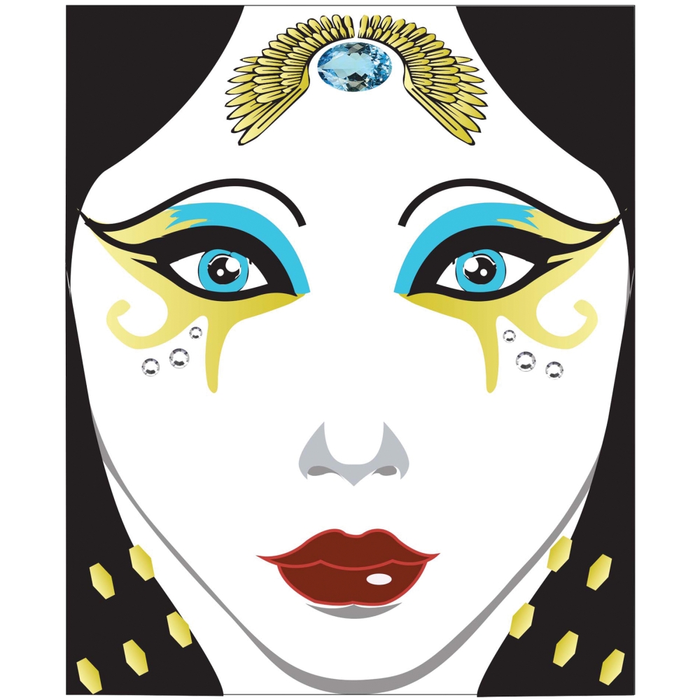 Ancient Egyptian Eye Makeup Is Stunning, But A Little Tricky To Do! This Egyptian Face Decal Is The Perfect Way To Add The Iconic Makeup To Your Egyptian Costume Without The Hassle! The Face Decals Have A Sticky Backing So Simply Peel Off And Apply Directly To The Face- The Application Is Easy And Foolproof! The Halloween Makeup Kit Includes Dark Black Egyptian Eye Decals With Gold And Blue Accents, Gold Wings, Small Silver Jewels And One Large Blue Jewel.