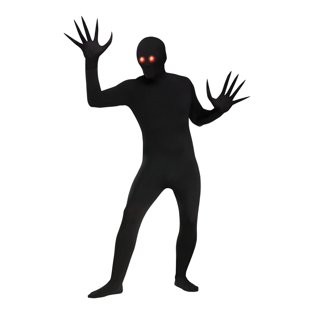 Here Is A Simple But Very Spooky Costume For Your Next Haunted Gathering! Black Long-Fingered Back-Zip Skin Suit Has A Black Hood, And A Fade-In-Fade-Out Eye Glasses Mechanism That You Wear Underneath. Requires 3 Aa Batteries, Not Included. One Size Adult Fits Up To 6 Feet- 200 Lbs.