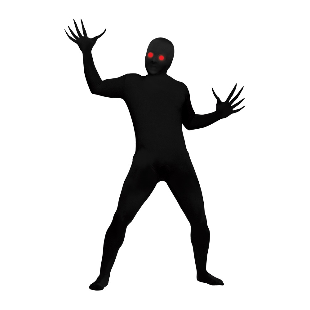 Here Is A Simple But Very Spooky Costume For Your Next Haunted Gathering! Black Long-Fingered Back-Zip Skin Suit Has A Black Hood, And A Fade-In-Fade-Out Eye Glasses Mechanism That You Wear Underneath. Requires 3 Aa Batteries, Not Included. Fits Children'S Sizes 12-14.