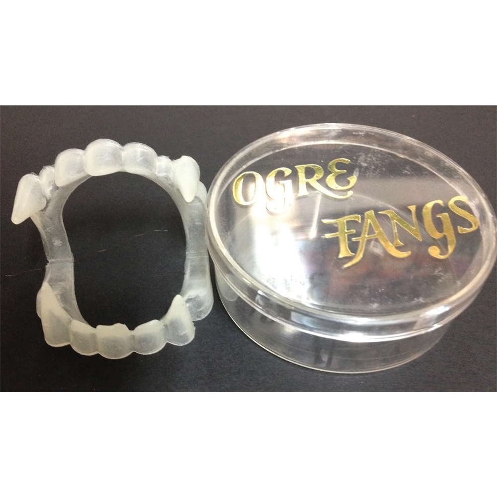 Soft plastic fangs have an upper and lower hinged together. Just slide over your own teeth. Wash before and between uses. Translucent white soft plastic. For adults and teens. Not for use by children under the age of 8.