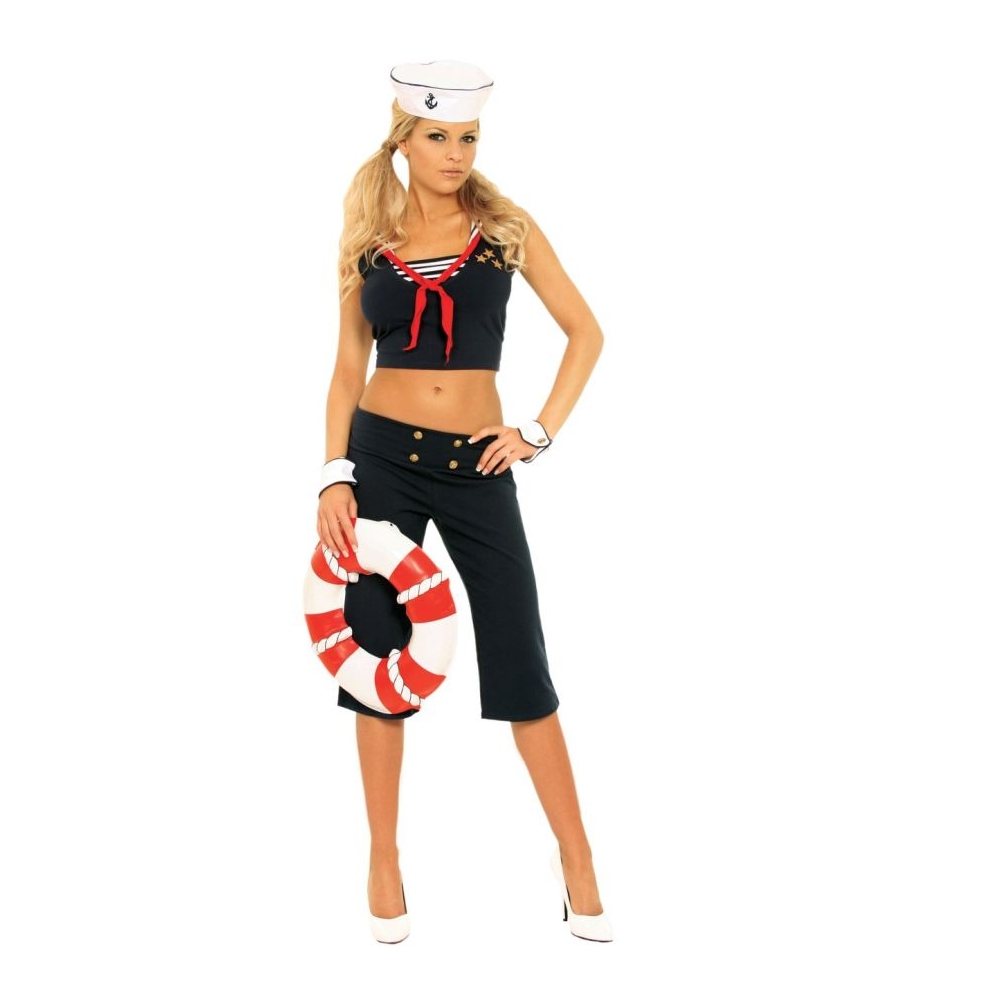 Blue Capri Pants, Top With Striped Sailor Collar, Scarf, White Cuffs, And Hat With Anchor Accent. Size Large 10-14