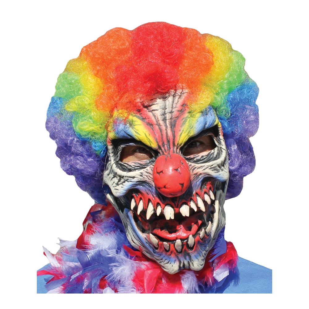 You Shouldn'T Invite This Clown Over To Your Child'S Birthday Party. Full Over-The-Head Latex Clown Mask With Hand-Painted Design With Multi-Color Clown Hair Attached. One Size Fits Most Adults.