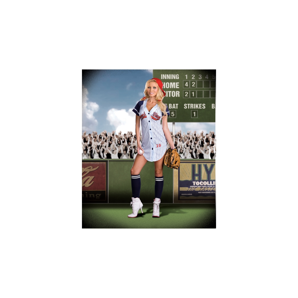 Stretch Knit Button Front Dress With Sequin Embroidered "Grand Slam" Appliqu And Heat Transfer Number "10" Detail On Back. Includes Stretch Knit Short With Elastic Waist, Baseball Cap And Athletic Knee High Socks. Glove Not Included. Women'S Md 6-10.