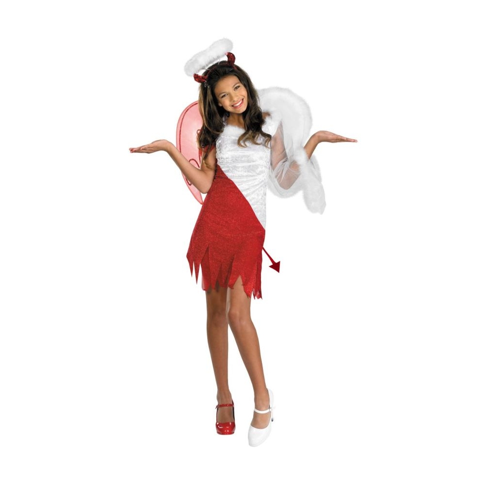 Jagged Cut Bottom, Half Red-White Dress With Attached Tail, Half Red-White Wings, Devil Horn Headpiece With Halo Attached. Child Size 10-12.