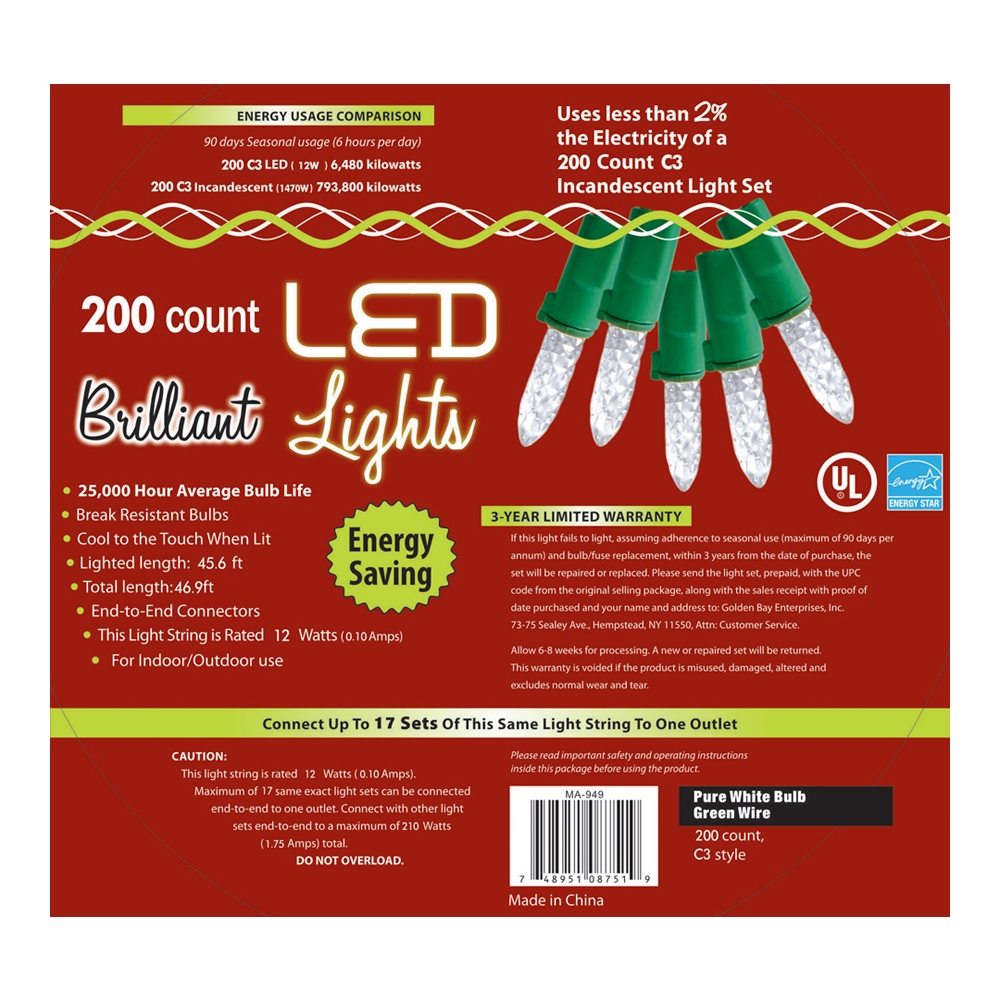 String Light Set Perfect For Christmas Or Party Decoration! Led Lighting. 200 Count Pure White Lighting With Green Cord. String Has A 45.6 Ft Lighted Length-47 Ft Total Length. Rated: 12 Watts (0.10Amps)-Set, 3.0A-120V Fuse, Spare:1 Fuse. Indoor-Outdoor Use. Connect Up To 17 Sets Of The Same Light String To One Outlet.
