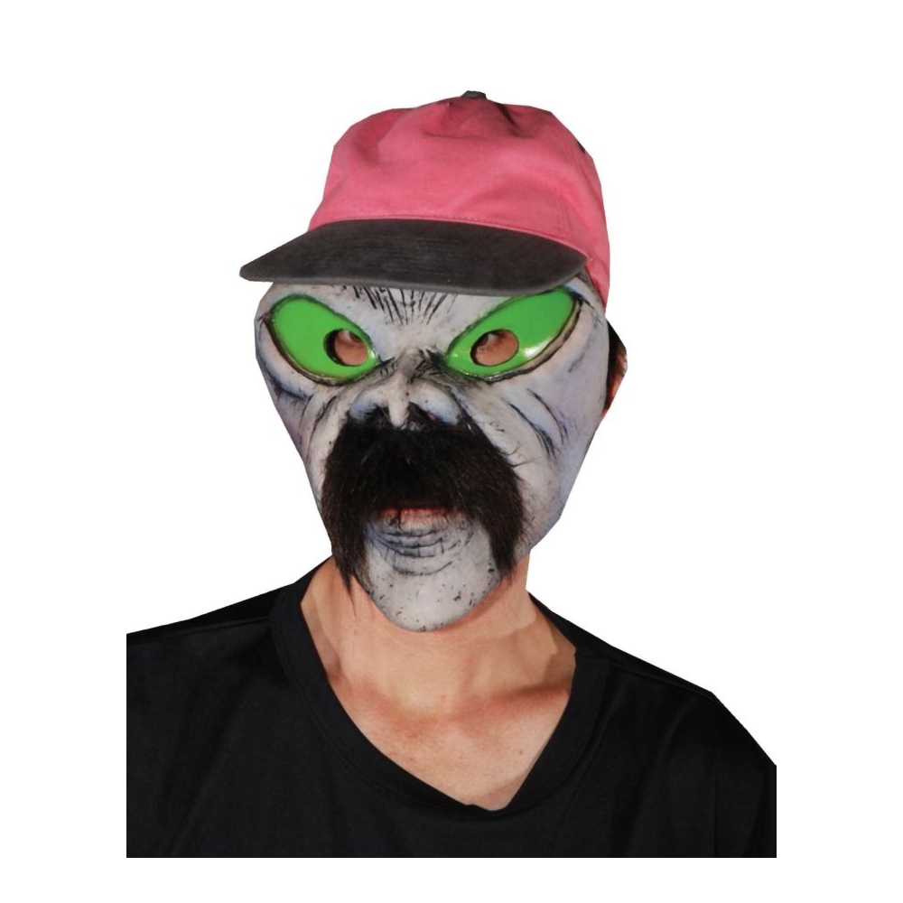 Keep Your Eyes Open For This One. Latex, Ufo Look Alien With Large Almond Shaped Eyes, Large Black Mustache And Attached Baseball Cap.