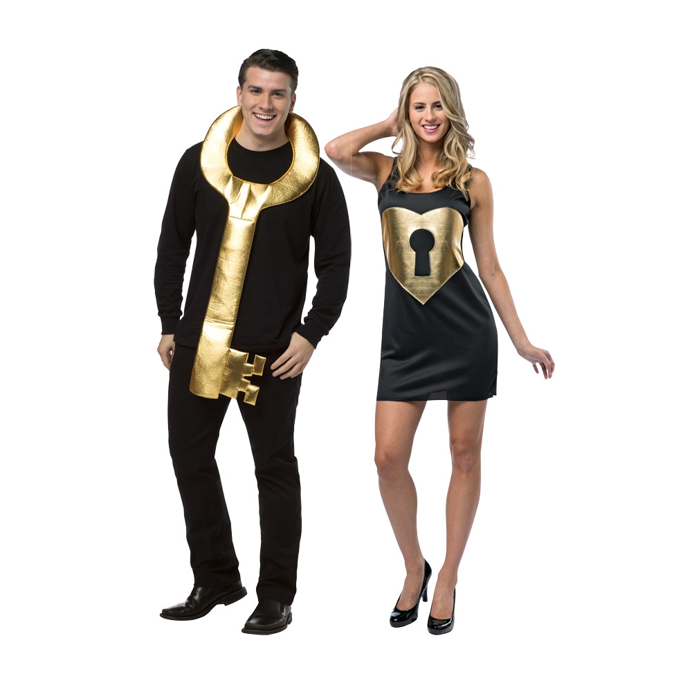 The Perfect Costume For Couples When He Really Has The Key To Your Heart! Gold Lame Cloth-Covered Foam Key For Man To Wear Around His Neck Comes With A Black Tank Dress With A Printed Golden Heart Locket. Both Pieces Are In One Bag. Just Add Your Black Pants And Shirt. Dress Fits Women Sizes 4-10. Men'S Key Is One Size Fits Most.
