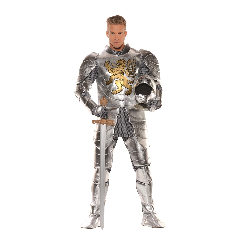 Who Wouldn'T Want To Be Rescued By This Dashing Knight? Metallic Screen Printed Tunic With Attached Shoulder Guards, Pants With Attached Leg Guards, Elbow Guards, Gloves, Shoe Covers And Helmet With Face Shield. One Size Fits Most Adult Males. Waist 34"-38" And Chest 42"-46".