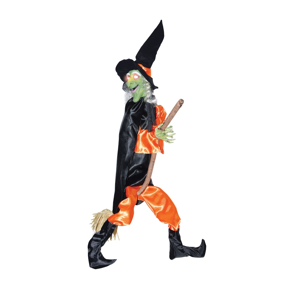 Fun Decoration Great For Any Haunted Scene! Witch Has Light Up Eyes, Kicking Legs, And Witch Sounds. Height 48" X Width 31" X Depth 5". Requires Three (3) Aa Batteries (Not Included). Sound Activated. Witch With Detailed Molded And Painted Face, Synthetic Hair, Full Fabric Suit With Boots And Matching Witch Hat, With Attached Cape And Broom.