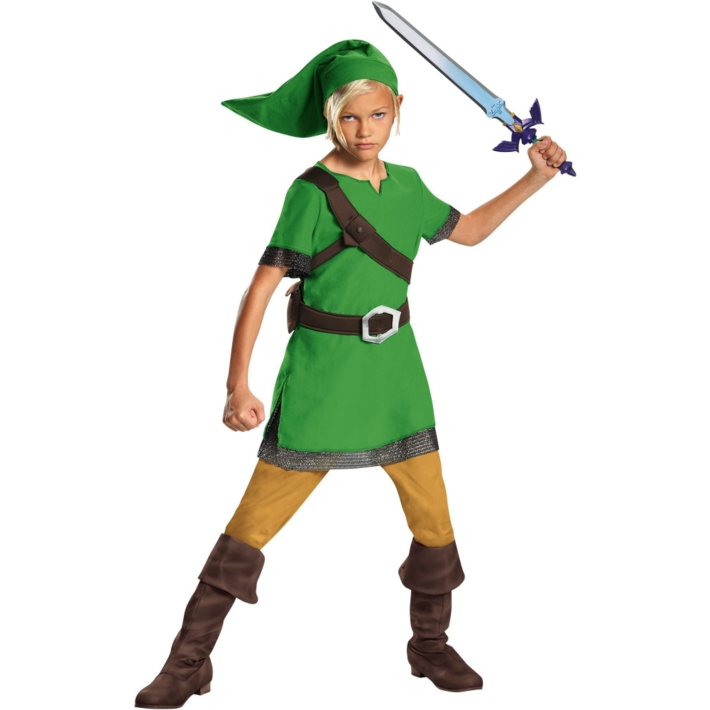 Green tunic with attached brown chest belt, waist belt with attached pouch, and green pointed hat. Weapon sold only separately. Add your own boots. Child large fits sizes 7-8.