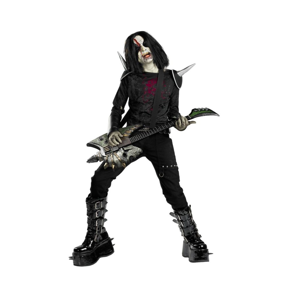 Black Shirt With Red Skull Design, Chinless Mask With Black Hair, Shoulder Armor And Gauntlets. Pants, Guitar, Boots, Belt And Makeup Not Included. Fits Child Size 7-8.