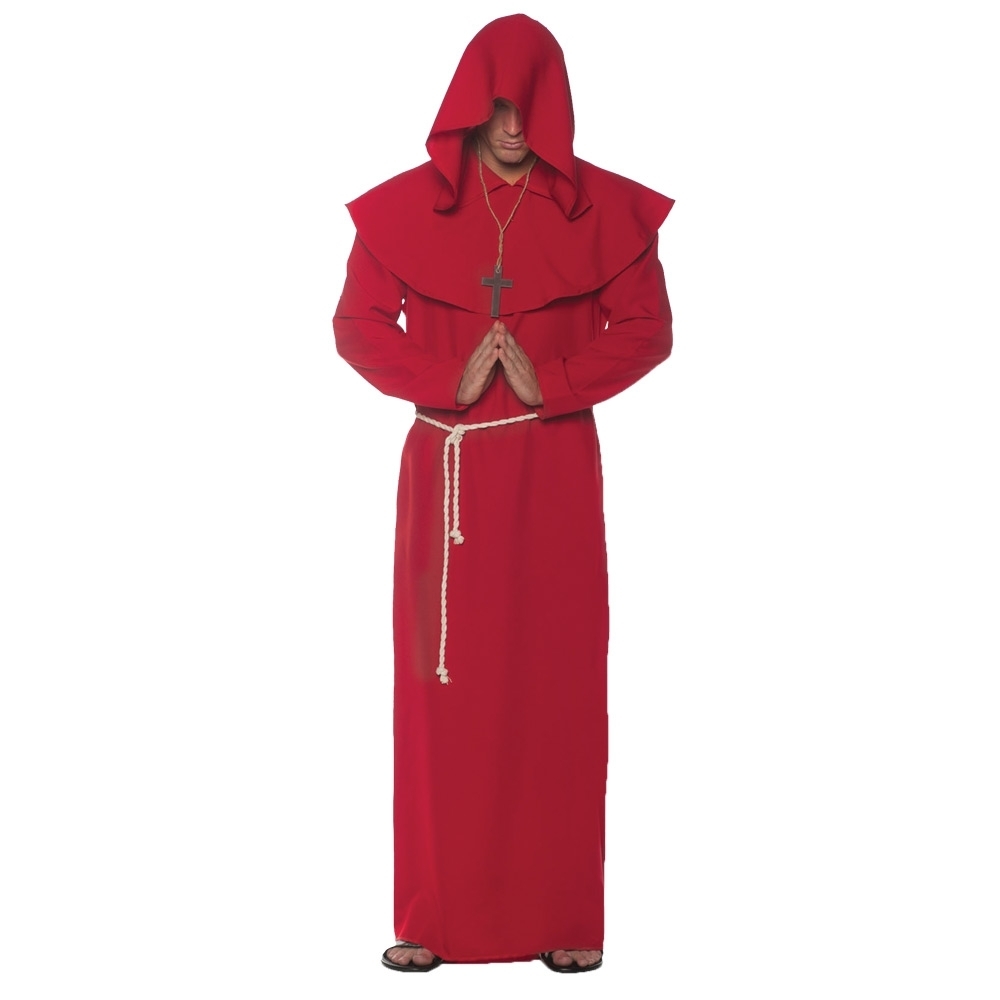 A Great Monk'S Robe With Many Uses. Comes With Red Robe And Matching Collar With Attached Hood. Collar Comes Just About To Center Of Chest. Costumes Also Comes With Rope Belt. Cross Necklace And Sandals Not Included. One Size Fits Most Adults.