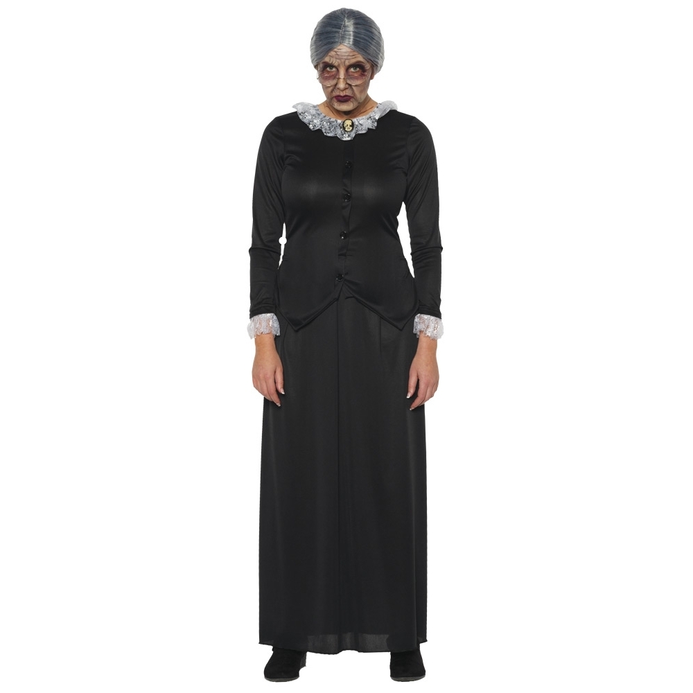 Great for evil old ladies and other great characters! Black full-length dress with look of button-up top and skirt with lace around collar and sleeves and attached cameo on collar. Wig, glasses and shoes not included. XLarge size fits adult womens sizes 14-16.