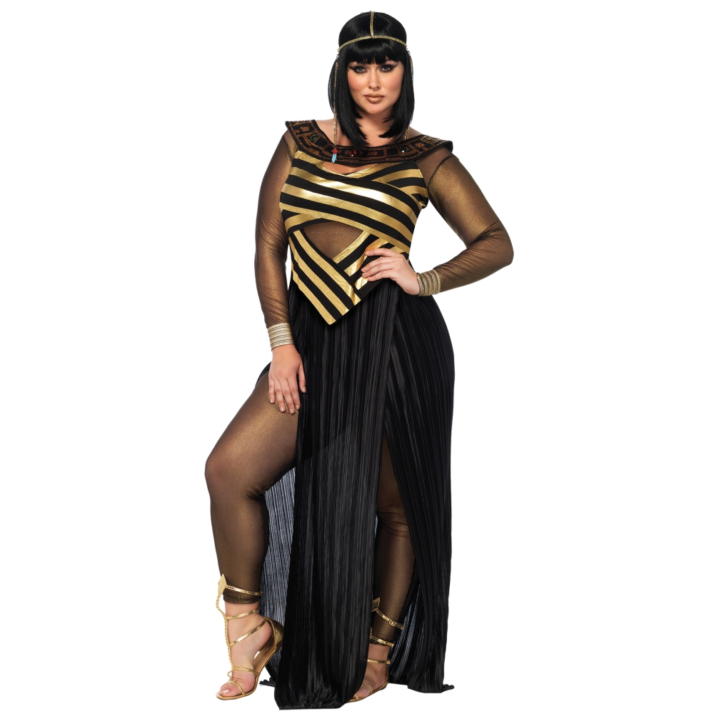 A Very Sleek And Sexy Dress That Will Mesmerize Your Prey And Compel Them To Serve Their Queen! Gold Shimmer Catsuit, Striped Cut Out Dress With Jewel Collar, And Matching Draped Head Piece. Gold-Black. Bracelets And Shoes Not Included. Fits Adult Womens Xxlarge Sizes 16-18.