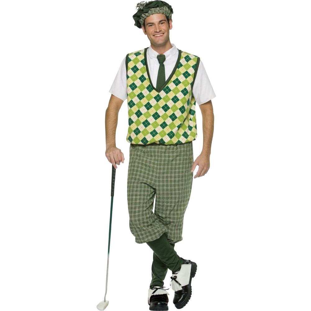 Great Look For That Golfer In Your Life! Costume Includes Hat, Sweater Shirt With Tie, Knickers, And Combination Sock-Shoe Covers. Just Add Your Own Golf Club! One Size Fits Most Adults Sizes 42-48.
