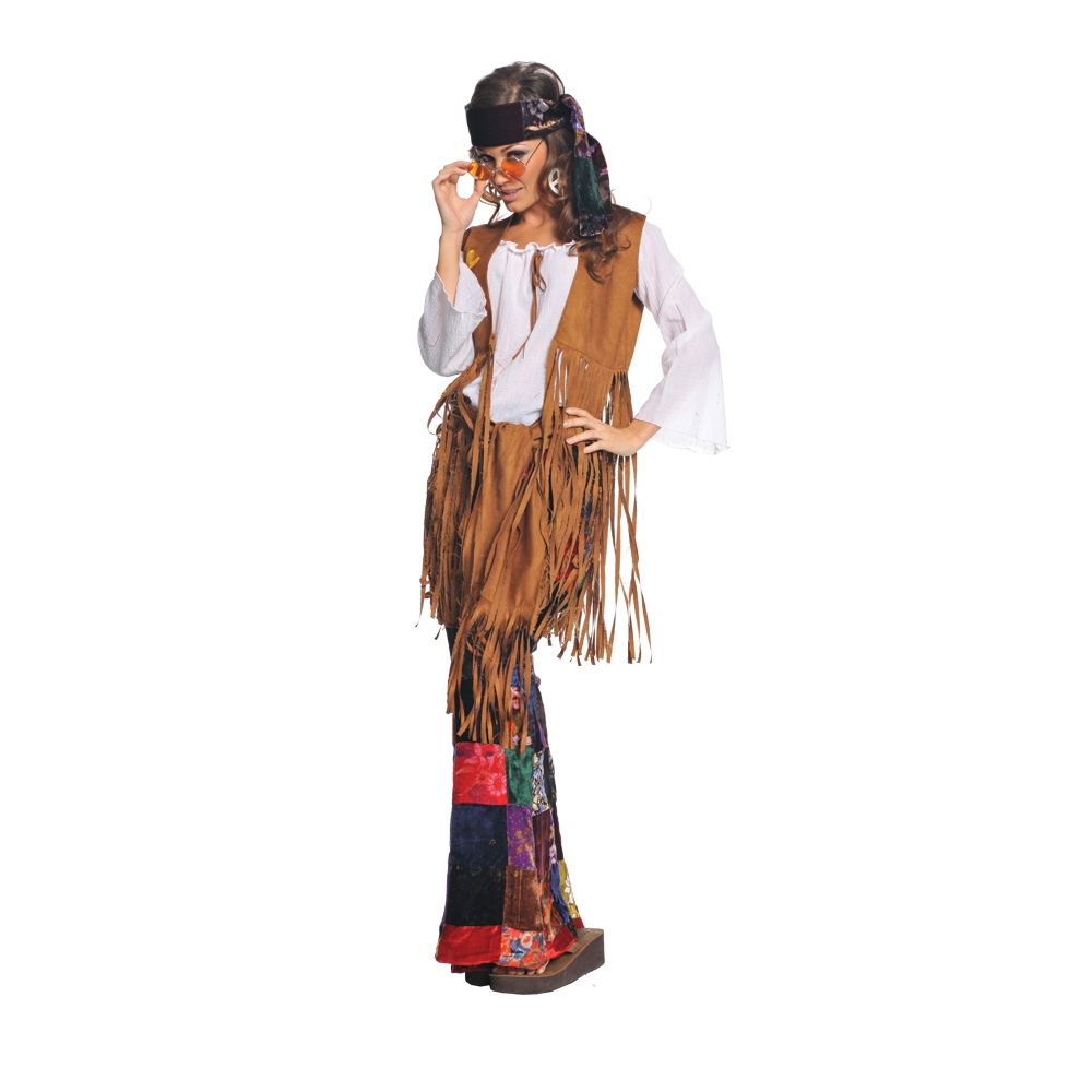 Fringed Faux Suede Vest, Velvet Patchwork Print Bell Bottoms, Headband. Adult Size 4-6.