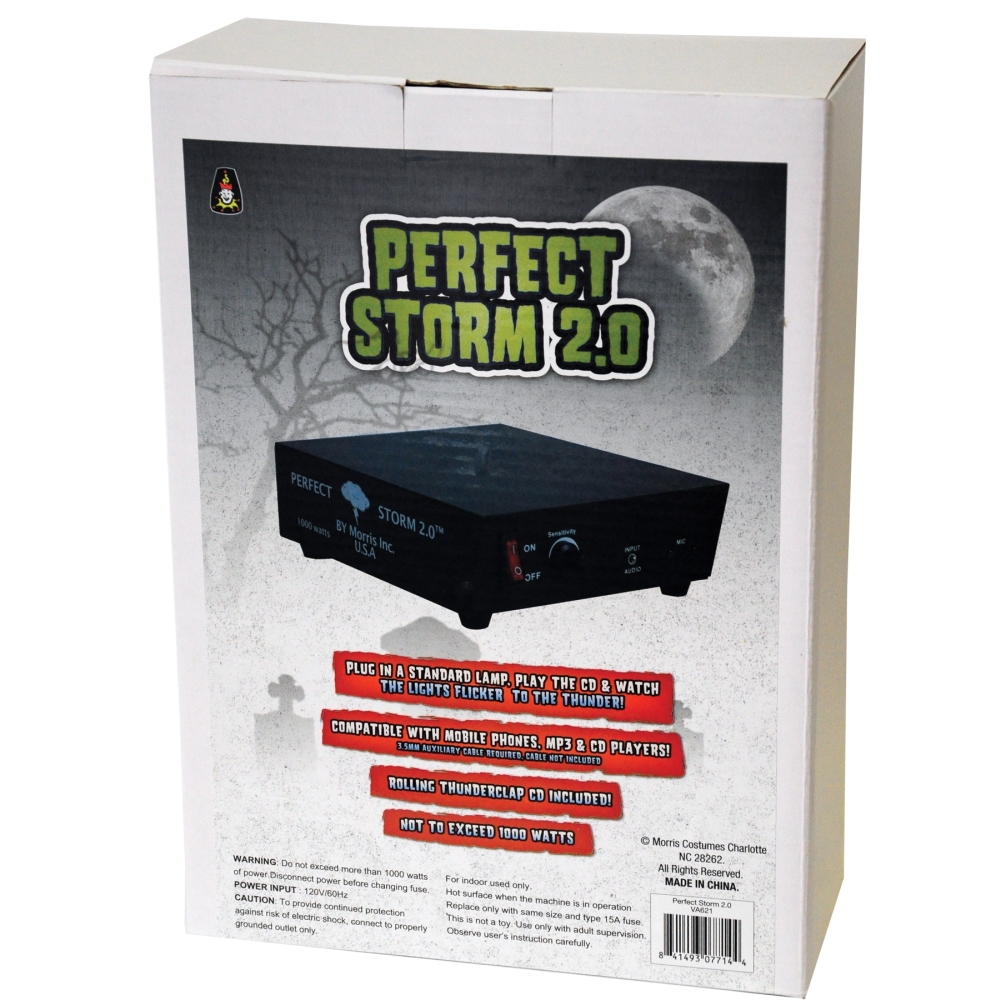 Perfect Storm Is A Sound-Activated Device That Allows You To Control The On And Off Flashing Of Lights When The Thunder Sound From The Cd Supplied Is Played. This Makes For Great Thunderstorm Effects For Your Haunted House Or Home Haunt-Halloween Party. Simply Play The Cd Provided With The Unit With Your Lights Plugged Into The Back Of The Perfect Storm Box (Which Can Be Plugged Into Any 15 Amp. 120 Volt Outlet). Please Note That Total Lights Used Should Not Exceed 1000 Watts Of Power Or A Reset Fuse In The Back Of The Unti Will Trip. If This Happens, Reduce Lights Used And Hit Reset Button On Back Of Unit. Besides Using Cd, You Can Also Place Whatever Sound Effect You Wish Into Your Tape Player, Mp3 Player, Smart Phone Etc And Either Place One Of Your Stereo Speakers Near Or In Front Of The Perfect Storm Unit Or Connect The Player Audio Line Out (The Proper Jack Cable May Be Needed, And Is Not Included) To The Perfect Storm Audio Input Jack. Using Either Of These Two Ways, When Thunder Is Heard, Lights Will Flash In Synchronized Fashion. Includes Cd With Over One Hour Of Sound Effects, Cd Player Not Included. Power Input 120V-60 Hz. Uses Type 15A Fuse. Ac Jack And Audio Jack. Round Sensor Knob On Front Of Unit Is Adjustable To Make Lights Flash To Your Liking. The Perfect Storm Will Work With A Variety Of Different Types Of Lights In Including Both Incandescent And Led. (Not Recommended For Fluorescent Lights).