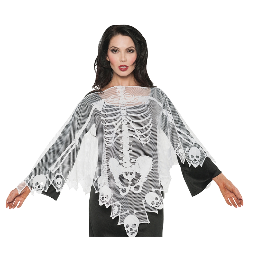 A Fantastic Accessory For Any Day Of The Dead Celebration Or Anytime You Want To Attract Attention. Very Versatile! White Lace Fully Detailed Skeletal Design Poncho. One Size Fits Most Adult Females.