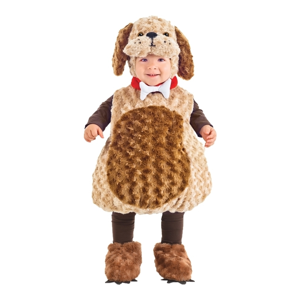 The cuteswt little puppy you will ever see besides the one you already have! Brown plush swirl fur body with holes for arms and legs, dark brown fur on belly, character designed hood, and shoe covers that match the belly fur. Fits toddler sizes 12-18 months. Leggings and shoes not included.