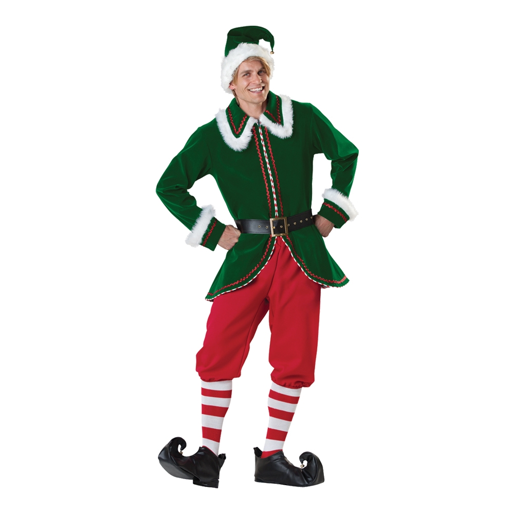 Flocked Velvet Jacket With Faux Fur And Red Metallic Accents, Pants, Belt, Hat With Faux Fur Trim And Bell Accent, Stripe Knee Socks And Shoe Covers With Bell Accent.