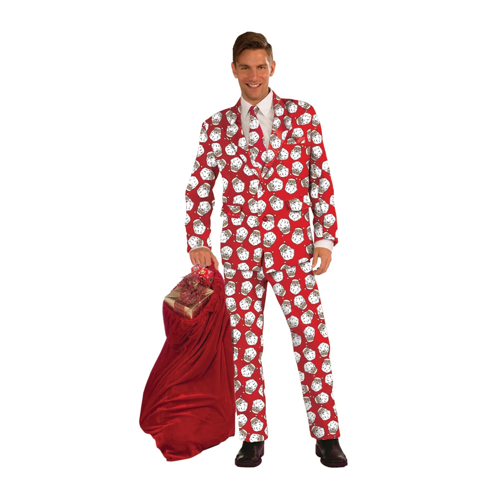 Make A Striking Impression At The Next Christmas Party You Attend Or Maybe Just Wear It Around Town Anytime For Fun! Red Jacket, Pants And Tie With Santa'S Jolly Face Pattern On The Suit. Standard Size Fits Males Up To Size 42" Chest.