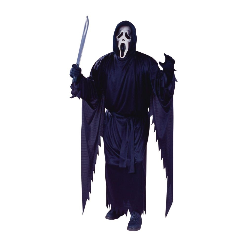 Black Polyester Robe With Long Jagged-Edged Sleeves And Attached Hood. White Vinyl Face Mask With Comfortable Elastic Strap Included. One Size Fits Most Men Between 5' 6" And 6' Tall, 140 To 200 Lbs. Waist Size 25" To 38", Chest Size 33" To 45".