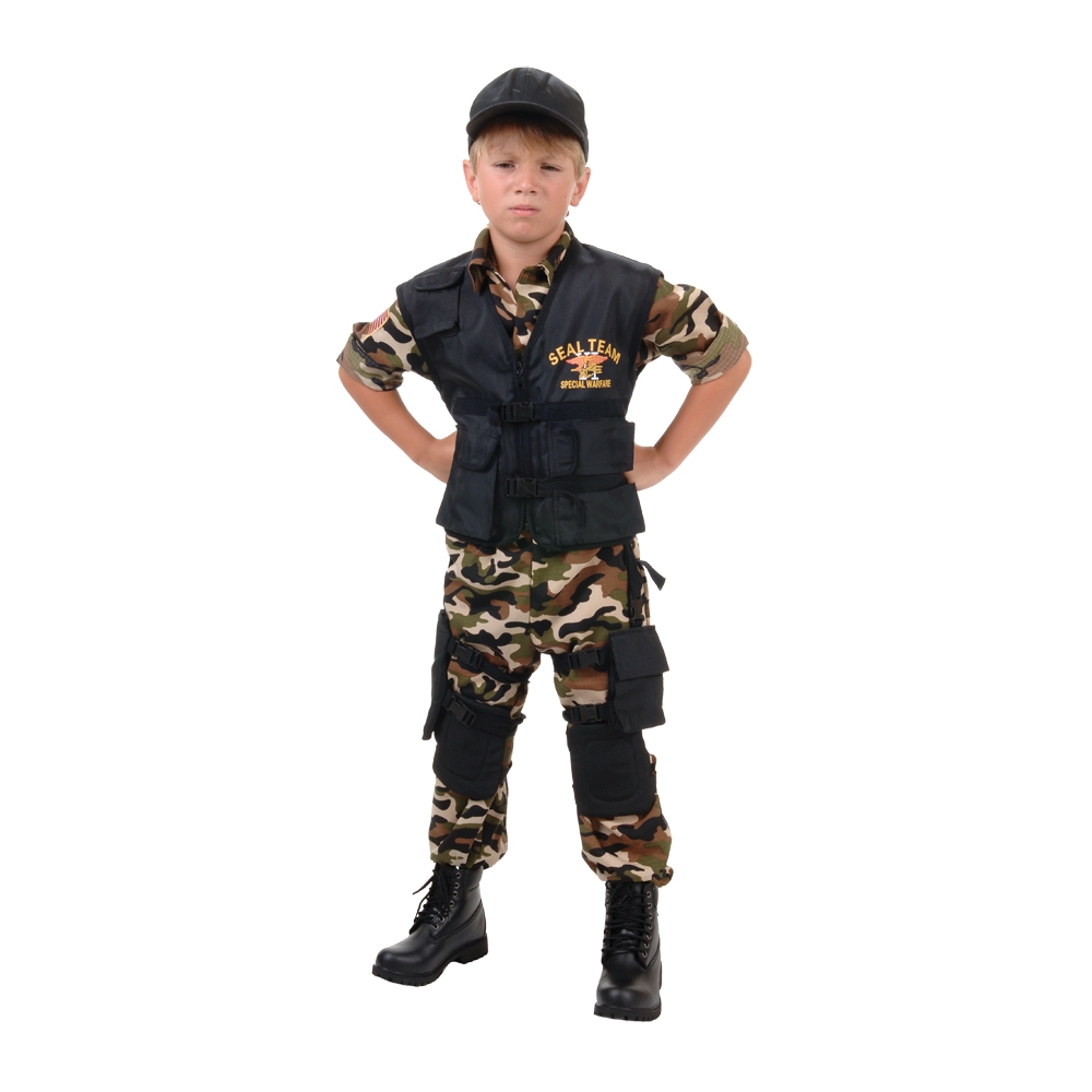 This Special Forces Branch Is Trained To Take Down The Enemy! Camo Jumpsuit And Black Vest With Seal Printed Logo Comes With Black Thigh Holster, Black Thigh Pouch, Black Knee Pads And Black Ball Cap. Child Extra Large Fits Sizes 14-16.