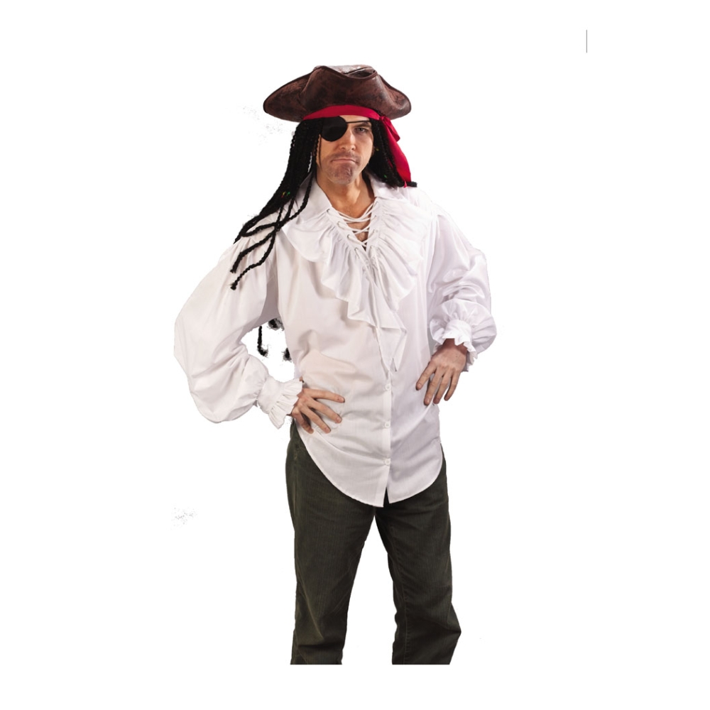 Poly-Cotton Blend Shirt With Ruffled Neckline, Lace-Up Front, Gathered Full Sleeves With Ruffled Cuffs. Excellent Shirt For A Pirate Or Colonial Period. One Size Fits Most Adults Up To Size 46.