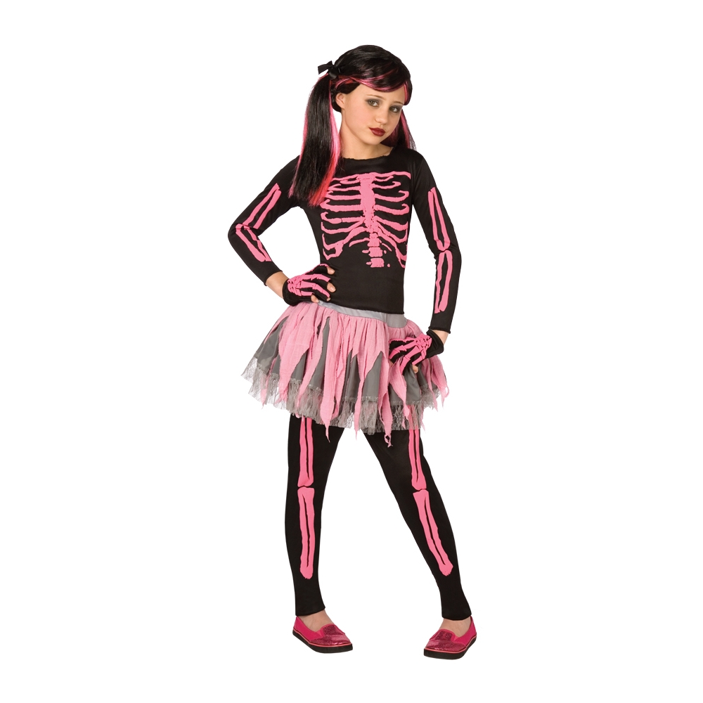 Black Top And Pants With Imprinted Pink Skeleton Comes With Tutu Skirt And Matching Skeleton Gloves. Child Large Sizes 12-14. 100% Polyester.