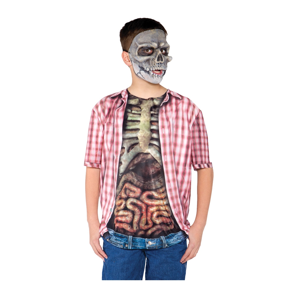A T-Shirt Wich Will Make You Look Like You Are Wearing A Red Plaid Shirt Half Open With A Visual Of The Wearer'S Skeleton And Guts Showing. The Back Of The Shirt Just Shows Red Plaid. Mask Not Included. Medium Child Size Fits Sizes 6-8.