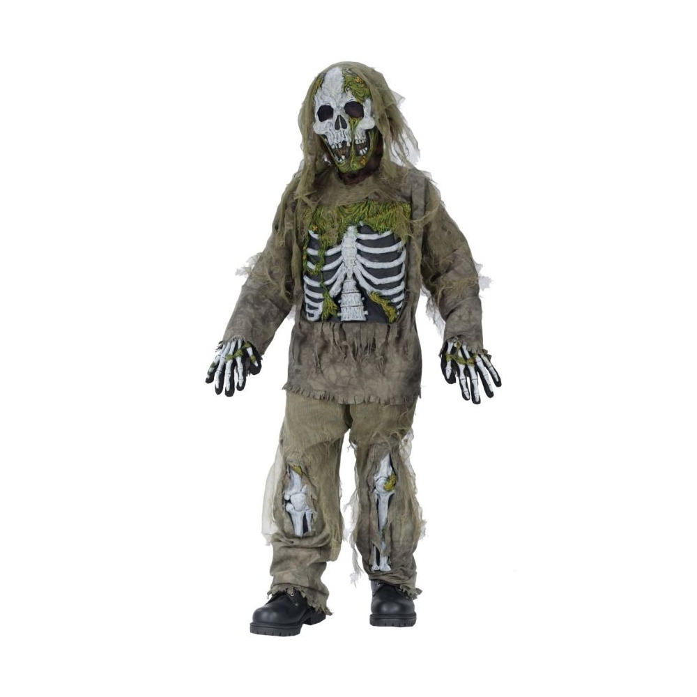 Straight Out Of A Cold, Damp Grave! Long Sleeve Shirt And Pants With Tattered Gauze Detailing, Gloves, Latex Chest Piece And Leg Bones Attached. Mask With Head Drape Included. Child Small 4-6.